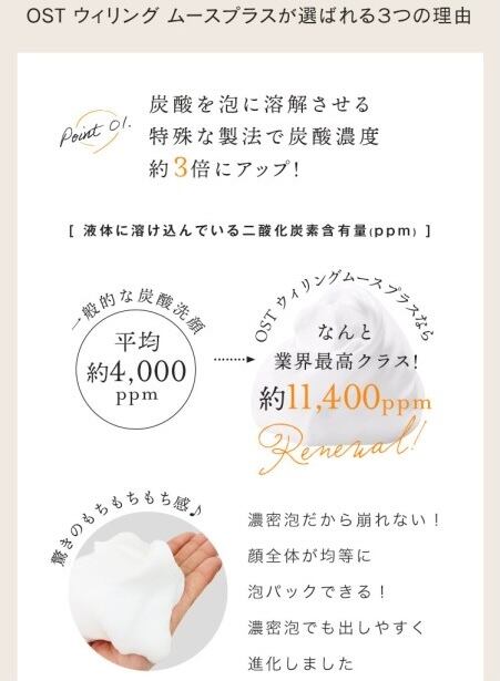 炭酸洗顔 willing mousse plus は、11,400ppm‼︎の高濃度炭酸洗顔でもちもちの潤い肌に導きます。